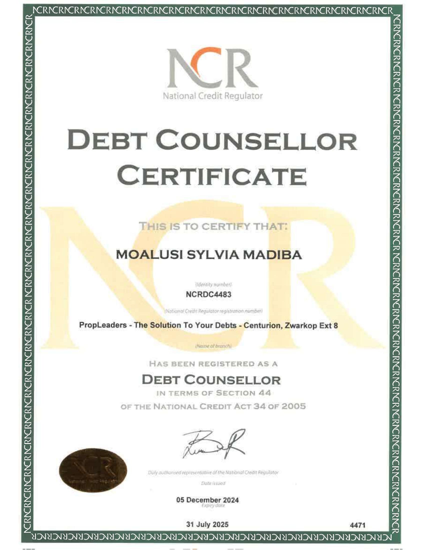 PropLeaders' services are provided through a careful selected network of well trained Financial Wellness Negotiators, Proposal Specialists, & Debt Counsellors registered with the National Credit Regulator of South Africa.